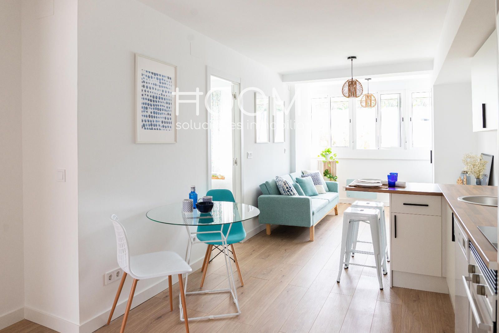 Hablamos de una finca en buen estado edificada en 1967, con la ITE favorable. Una 1ª planta exterior a estrenar. Dispone de una distribución muy funcional, que nos ofrece un amplio espacio que aúna cocina equipada con comedor y salón amplio, 2 dormitorios, 2 baños completo con plato de ducha y mampara, uno de ellos en suite. Hiper luminoso gracias a sus grandes ventanales.